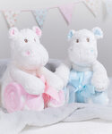Soft plush hippo with contrast blanket. Contrast feet, nose, and horns. Sewn eyes. Hook and loop fastening on feet and paws. Blue and white spotted velour blanket. Complies with EN71 European Toy Safety regulations. Remove all hang tags and their fasteners before giving these items to a child. Suitable for all ages.